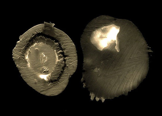 The leftovers of an apple pie. The photos are Polaroid emulsion lifts on cheap scrap paper. Ass what remained of the apple, the photos will decay in time.
